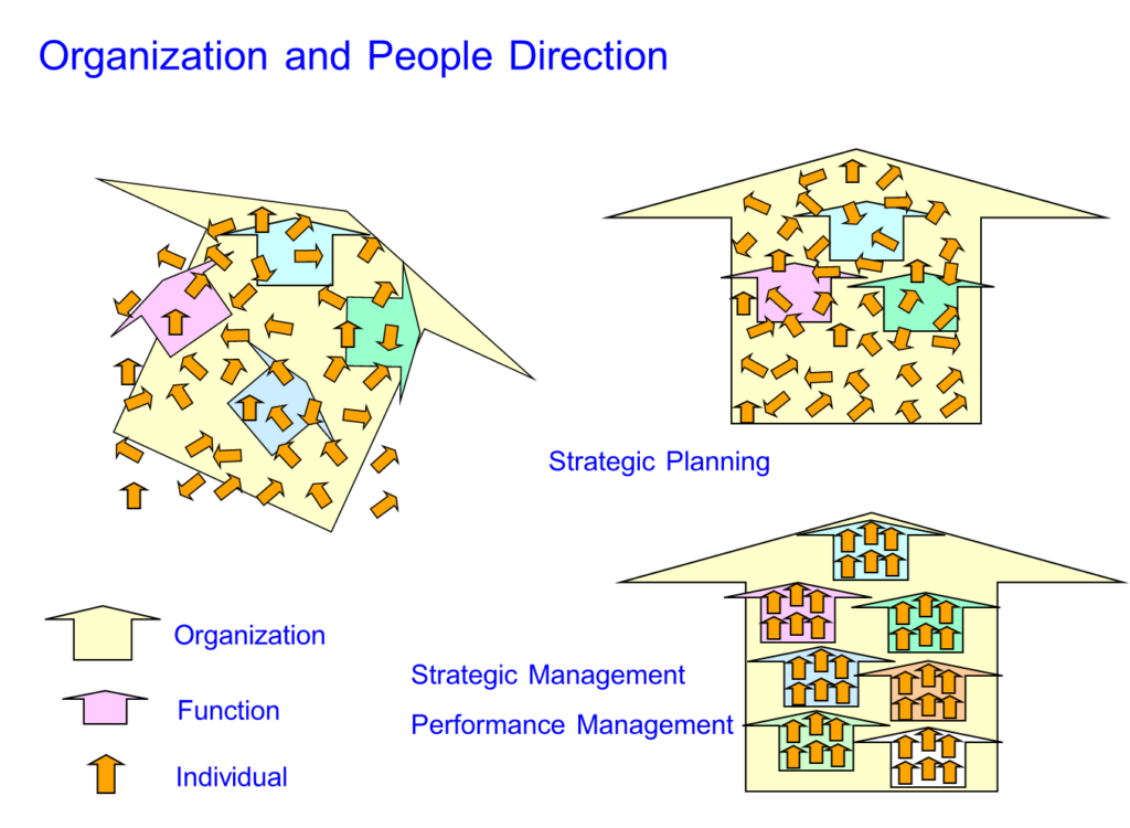 การบริหารผลงานไม่ได้เป็นเพียงการประเมินผลงานประจำปีเท่านั้น แต่ยังเป็นกระบวนการเชิงกลยุทธ์ที่สร้างการเชื่อมโยงอย่างชัดเจนระหว่างผลการทำงานของบุคคลและทีมกับเป้าหมายขององค์กรด้วย (ภาพเล็กที่ 3) องค์กรหลายแห่งอาจกำลังประสบปัญหาที่ว่า พนักงานต่างก็ปฏิบัติงานและบรรลุเป้าหมายตามที่ได้รับมอบหมาย แต่องค์กรกลับไม่ประสบผลสำเร็จหรือขาดทุน (ภาพเล็กที่ 1) พนักงานไม่ทราบหรือสงสัยว่างานที่เขากำลังทำอยู่มีเป้าหมายเพื่ออะไร (ภาพเล็กที่ 1,2) จากตัวอย่างดังกล่าว แสดงให้เห็นได้ว่า องค์กรยังขาดกลไกบางอย่างในการเชื่อมโยงเป้าหมายการปฏิบัติงานของพวกเขากับเป้าหมายขององค์กร